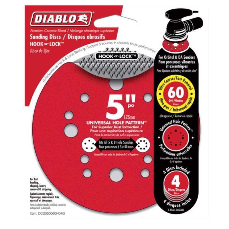 Features: Universal hole pattern, a one-size-fits-all design (fits all 5 and 8 hole sanders) for fast and precise alignment Premium ceramic blend, a superior quality formulation designed for fast material removal and long sanding life Premium hook and lock