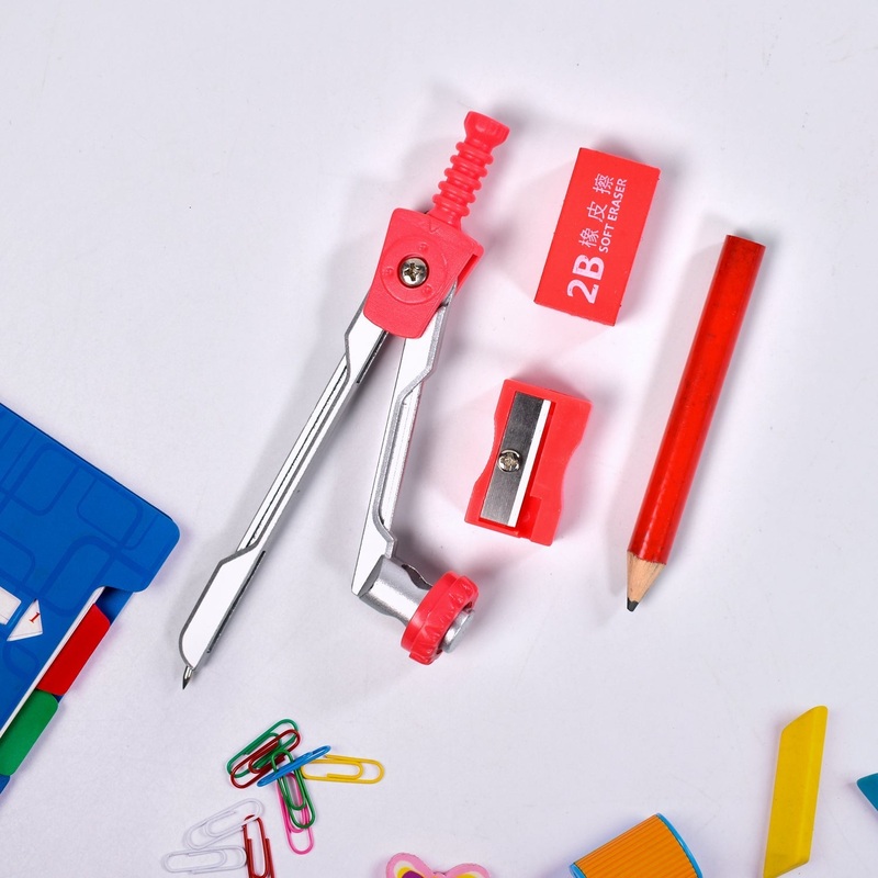 • 8 Pieces Per Set This geometry set contains 8 pieces math geometric tools, including 1 compass, 1 rubber, 4 rulers, 1 pencil.