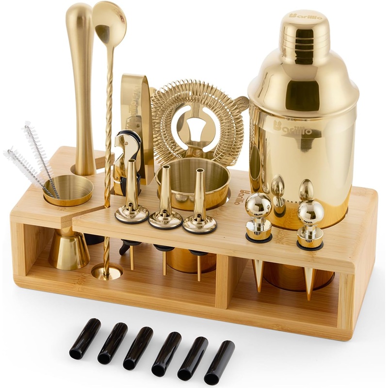 Barillio Gold Bartender Kit Stainless-Steel Cocktail Shaker Set w/Bamboo Stand Mixology Bar Tools w/Drink Shaker, Mixer Spoon and Muddler for Cocktails Home Bar Accessories 23-Pc Bar SetBARTENDING KIT: Designed by bartenders, this 23 piece bar tool set has