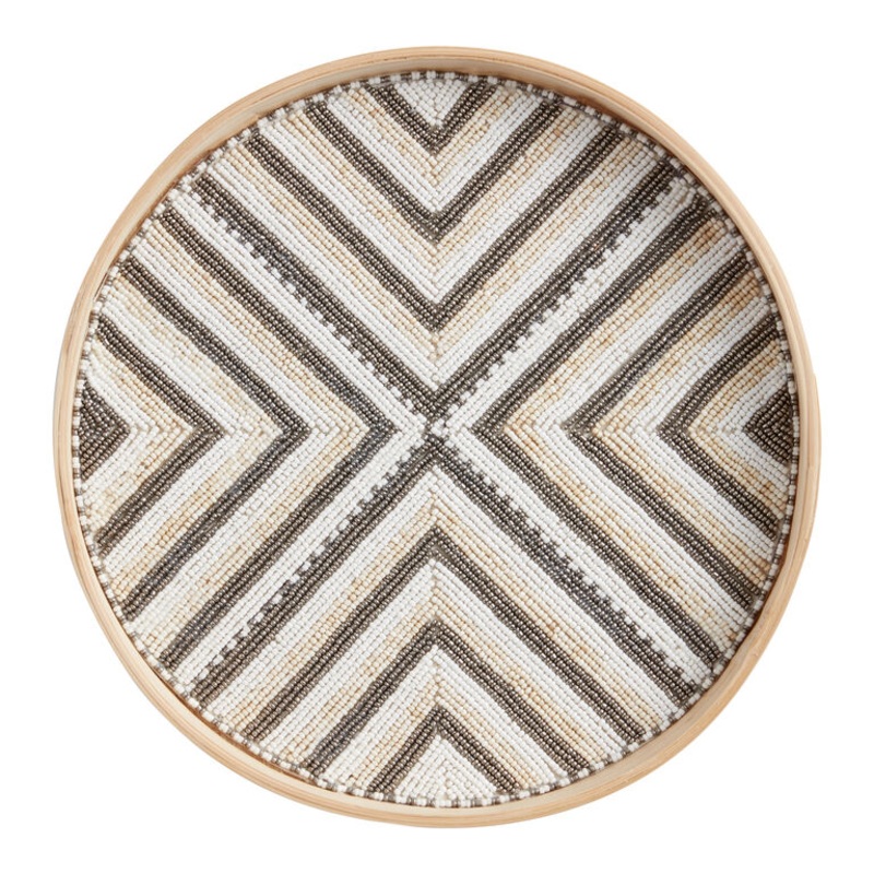 This bamboo tray is made in India and adorned with thousands of gleaming white and bronze beads carefully arranged in a chevron pattern. A gorgeous blend of timeless craftsmanship and contemporary good looks, it's dazzling wherever you display it. Handcraf