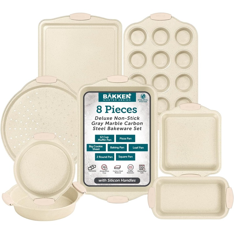 Deluxe 8-Piece Carbon Steel Bakeware Set Nonstick White Marble Coating, Silicone Handles Professional Quality Kitchen Oven Baking PansIntroducing the BAKKEN Kitchen Oven Baking Pans a deluxe 8-piece bakeware set designed to elevate your baking experience.