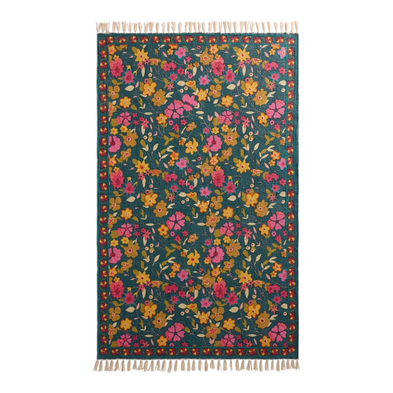 Screen printed with the multicolor garden of our exclusive floral design, our Ditzy 3×5 handwoven cotton rug is an intricately embroidered work of art. Popping brightly from a soft midnight-blue ground, each botanical motif of this dynamic area rug is highlighted with dimensional embroidery. Embellished with flower-emblem borders and finished with bright white tassels, this small-space statement piece is available at a special World Market value.