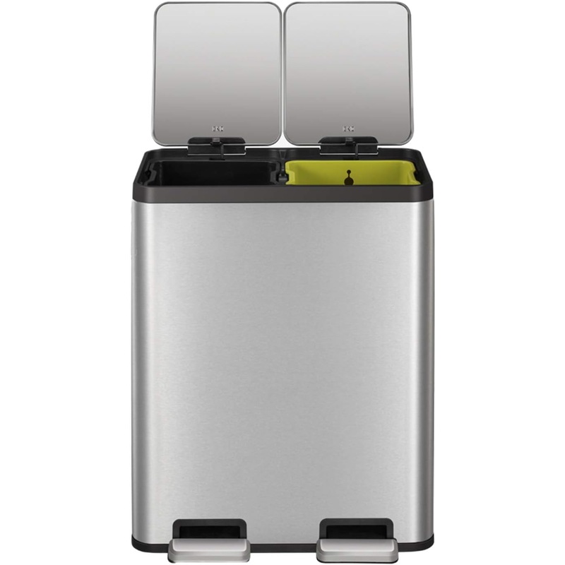 The EcoCasa II Stainless Steel Dual Compartment Recycle Step Pedal Trash Can is the perfect way to manage your homes regular waste and recyclable materials. Two inner compartments, each with a 30L (7.9G) capacity, have easily removable inner liners to separate your trash for responsible recycling. Independent cantilever foot-pedal mechanisms open dual lids with Soft Close for a gentle closing and theres a Stay Open mechanism when needed. The space-saving rectangular design fits flush against your wall. The fingerprint-resistant brushed stainless-steel finish is easy to maintain with a soft cloth as required. Side handles for easy repositioning within your home. Inner buckets each feature a plastic bag stabilizer to prevent your trash bag from slipping out of place. US-based customer service support team. Dimensions: 20.9W x 14.6D x 26.2H. Height with lid open: 37.6