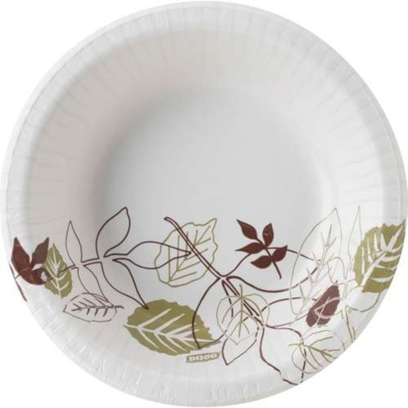 These heavyweight paper bowls feature a soak-proof shield and a unique multilayer design that is cut-resistant and helps keep grease from seeping through to the table or tray. Each 12 oz bowl is microwavable with a remarkable inner strength and heavyweight construction. The compact, low-stacking shape saves up to 60% of storage space versus pulp molded and 90% versus foam plates. There is a total of 1000 food bowls per case in packs of 125, making this a great donation for nonprofits feeding those in need. Order yours online today while supplies last. Size 12 fl. oz Color: White with Green leaf design 125 bowls per pack 8 Packs per case (total of 1000 bowls)