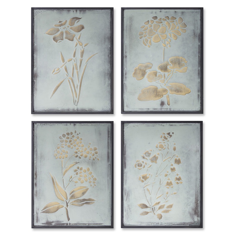 Our wall art is elegant and romantic. Each floral design is embossed in metal. The distressed finish reveals hues of gold, green and black.Made from ironMeasures 15.75 inches in heightComes as a set of 4Ideal for seasonal decoratingDimensions: 11.75 x 1 x