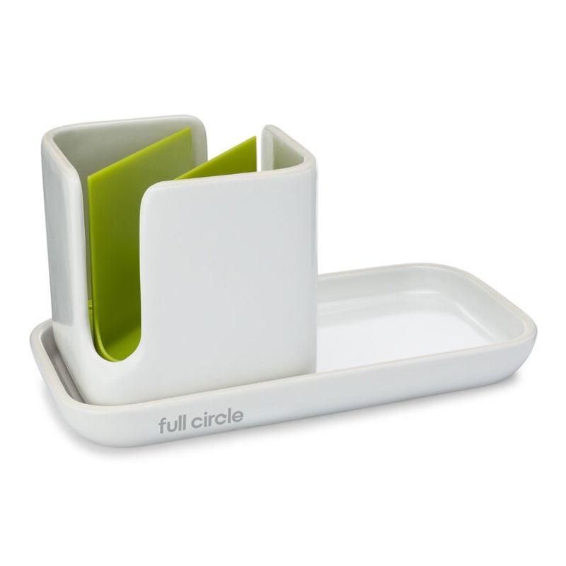 This Full Circle modular sink organizer includes a white ceramic tray for your soap bottle, a matching caddy for dish brushes and a green insert that holds a sponge. Each component is adjustable or removable: you can place the caddy on either side of the tray and use it with or without the sponge holder. Compact, durable and convenient, this Full Circle sink system brings streamlined storage to your kitchen cleaning essentials.
