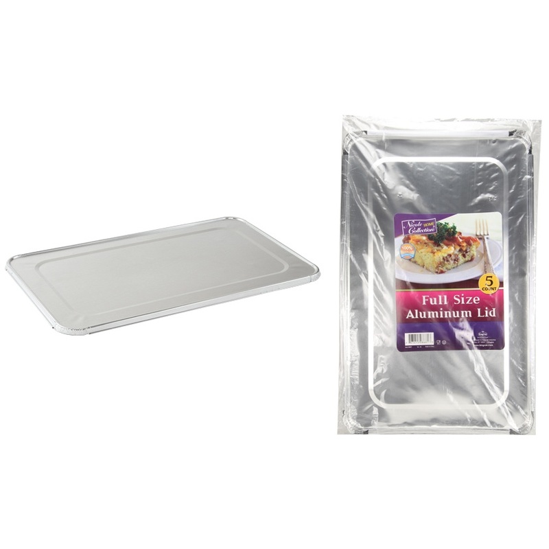 Keep food fresh and covered with these aluminum lids that fit full size aluminum disposable pans. The kosher certified pan lids come in a pack of five and are oven and freezer safe. The five full-size lids come in a retail ready poly bag with a total of 10 bags per case. Size: 21.5\