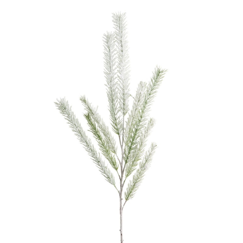 Handcrafted with attention to detail, this green faux-pine stem is coated with varying layers of snowy glitter to create its naturalistic splendor. This posable greenery features textured branches, wispy needle-like leaves and tonal layers of flocking that sparkle like ice crystals. A rustic spray for seasonal tablescapes, its realistic texture layers beautifully with bright Christmas flowers and a wide array of our handmade holiday decor.