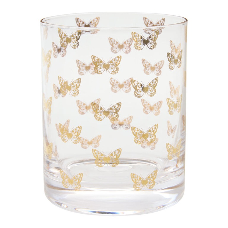 Bring nature-inspired beauty to your home bar with our double old-fashioned glass, available in butterfly and dragonfly designs to mix and match. It’s made of clear glass with repeating gold insect artwork, modern straight sides and a thick sham. Our bar glass adds a fluttering finish to a Manhattan, a negroni and – of course – an old fashioned cocktail.