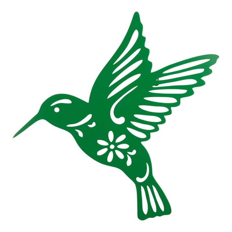 Add a lively accent to porches, patios and garden walls with this kelly-green hummingbird wall decor. Made of metal and ready to hang in entryways or patios, this bird in flight has a cutout feather design with a floral motif in the center. Its a cheerful