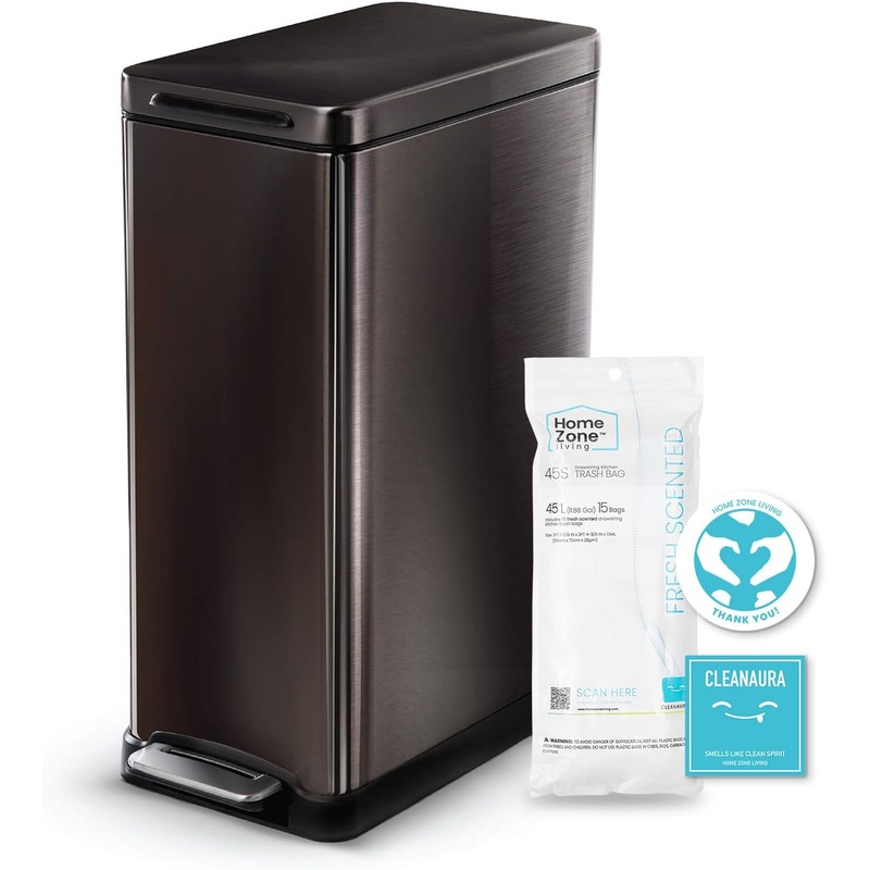 Home Zone Living 12 Gallon Slim Kitchen Trash Can, Stainless Steel, Step Pedal, 45 LiterKitchen trash cans dont need to be a burden or an inconvenience at home. Rather, we are looking to make waste management easier for you. With this 12 gallon / 45 liter