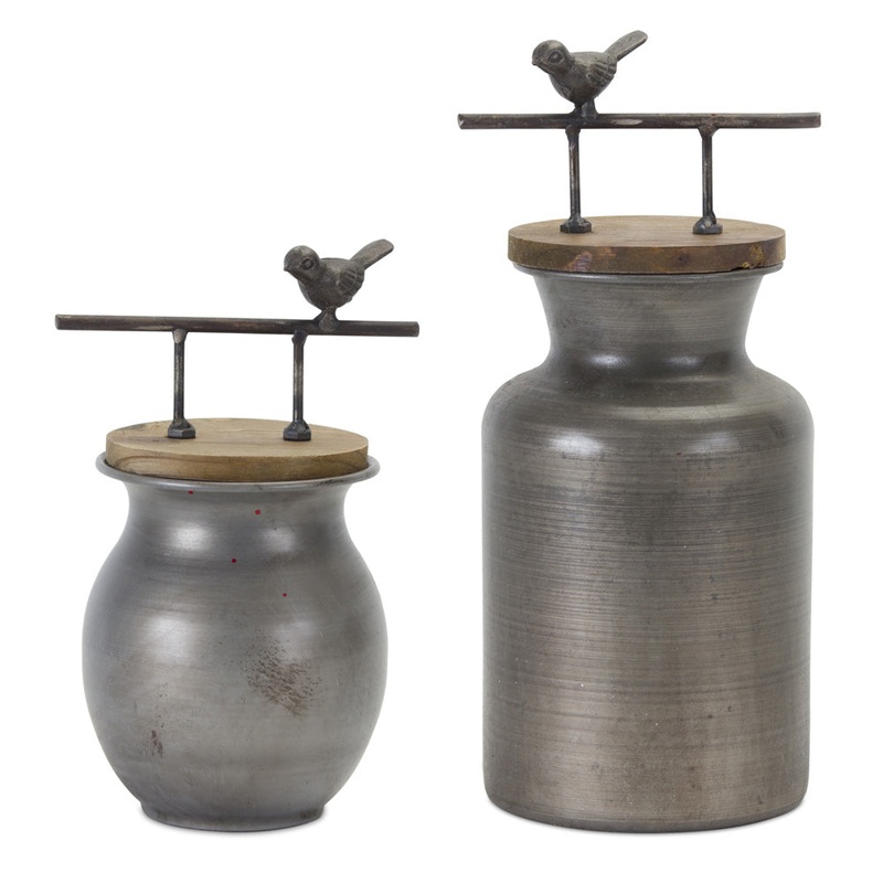 Jar With Bird Handle (Set of 2) 8.5H, 11.25H Iron/Wood