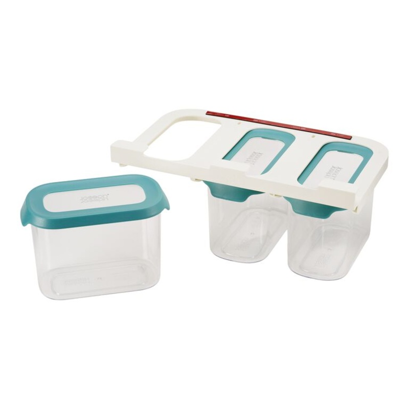 Save space with Joseph Joseph's storage container set that preserves the essential dry foods inside or underneath a kitchen cupboard door. Attaching with extra-strong 3M VHB tape for an easy tool-free installation, the set includes three slide-out containe
