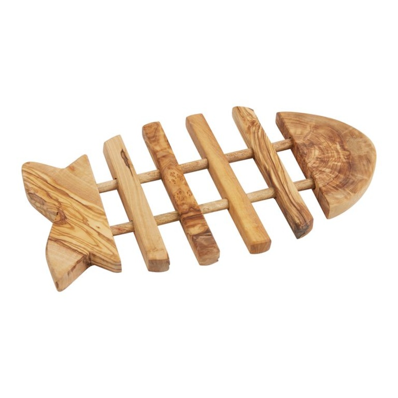 Hand carved by Tunisian artisans of natural olive wood, this fish-shaped trivet protects countertops and tables from the heat and moisture of hot cookware. Durable for indoor and outdoor entertaining, it features fishbone-inspired cutouts that allow air to