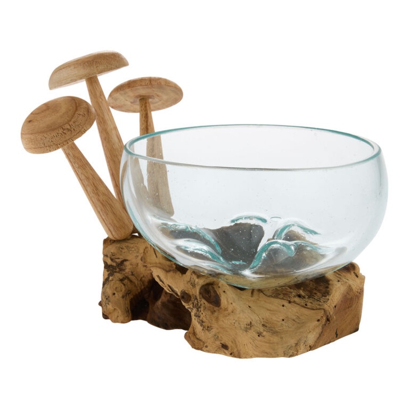 A charming cluster of sculpted mushrooms adorn our striking handblown glass bowl that's molded to the shape of the natural driftwood below it. Handcrafted in Indonesia using mango wood to represent the wild 'shrooms - which can be removed to change up the