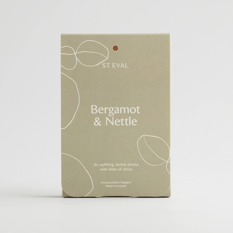 St. Eval Bergamot & Nettle Maxi Tealights – Lamorna Collection – Natural Rapeseed Wax – Uplifting Blend of Herbal Bergamot and Fresh Nettle Leaves – Made in Cornwall – Pack of 6