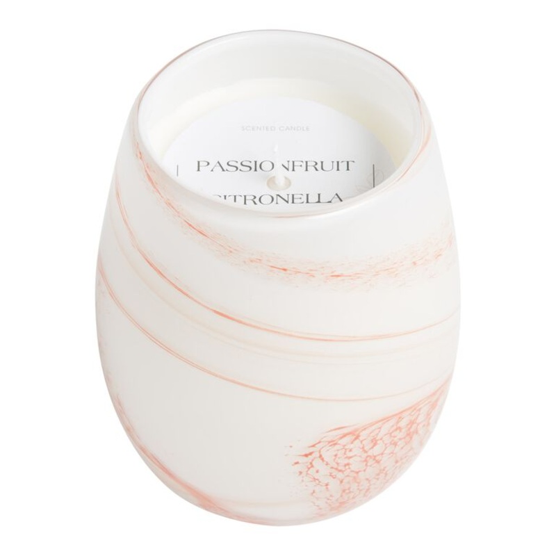 A fresh take on the classic citronella fragrance used to repel bugs, our exclusive passionfruit scented candle fills your space with inviting fruity aromas. Contained in a coastal-inspired swirly glass jar, it's formulated with a base of citronella oil to