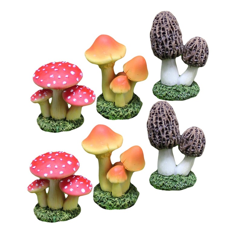 Package Include 6 x Mushroom Decors Characteristics -Size:5.00X3.30X2.50cm 1.97X1.30X0 tiny mushroom decor. -Material:Resin small mushroom decor -Size:3.90X3.90X2.80cm 1.53X1.53X1 micro landscape mushroom. -Size:4.20X3.30X3.00cm 1.65X1.30X1 mushroom orname