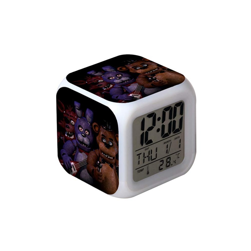Specification: Size: 8 8cm Material: ABS plastic Weight: 170g Features: Fredi’s design pattern, if you like this game, then you will also like this alarm clock With English manual, it is convenient for you to understand its functions 1. Please allow 1-5MM error due to manual measurement. 2. Due to the difference between light and screen, the color of the item may be slightly different from the picture. ?Package list: 1x alarm clock 12x English manual?Things You Must Know: This alarm clock needs 2x AG13 Batteries(included) for clock LCD display, and 4x AAA batteries(not included) or the included charging cable for LED lights up. ?LED Display: The Alarm Clock backlit display features time, date and temperature that are very clear to see, glow in the dark. 12 hour and 24 hour format, along with Fahrenheit and Celsius temperature can be switched between with one mere push. ?Lovely Look: It looks great on your nightstand or desk, adding some fabulous colors to home decor. It can be used as a multi-colored night lights, mood night light, atmosphere lighting, bedroom clocks, interior lighting, wake up clock. ?7 Colors Backlight: The alarm clock boasts dreamlike one tap-activated backlight. Check time in darkness without turning on the light. Soft light creates a fantastic atmosphere as a lamp at night. ?Easy to Set: Press “set” to activate the girls clock, press UP DOWN to set at the sequence of hour-minute-year-month-day-week, easy for kids. LCD displays hour(12-hour and 24-hour time format), week, date, temperature (? or ?).
