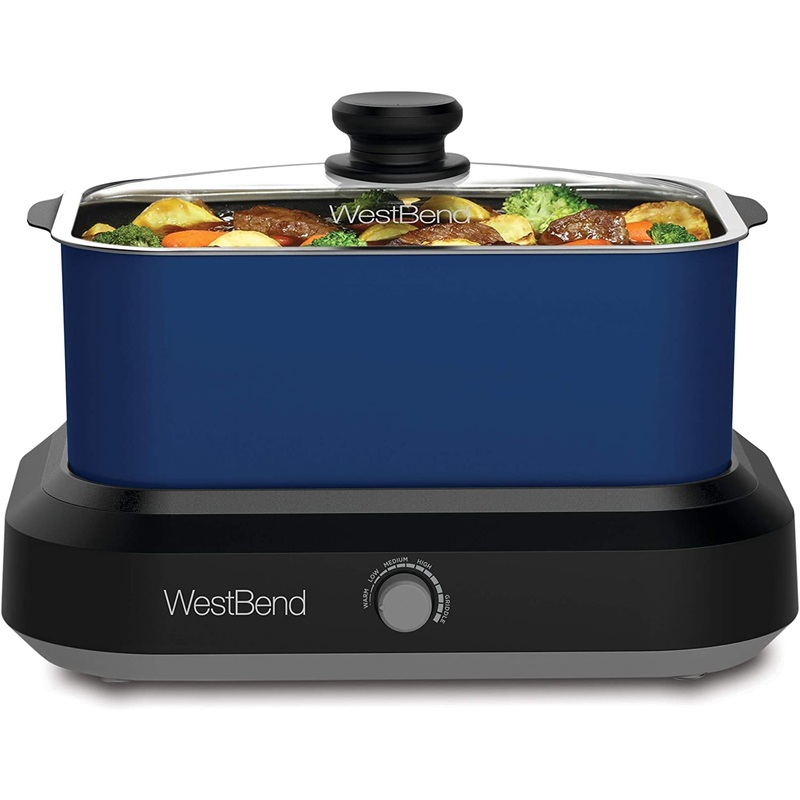 West Bend 87905B Slow Cooker Large Capacity Non-stick Variable Temperature Control Includes Travel Lid and Thermal Carrying Case, 5-Quart, BlueVersatile Crock Pot: Slow cook almost any sized meal, from a dinner for 2 to enough to entertain a crowd with the