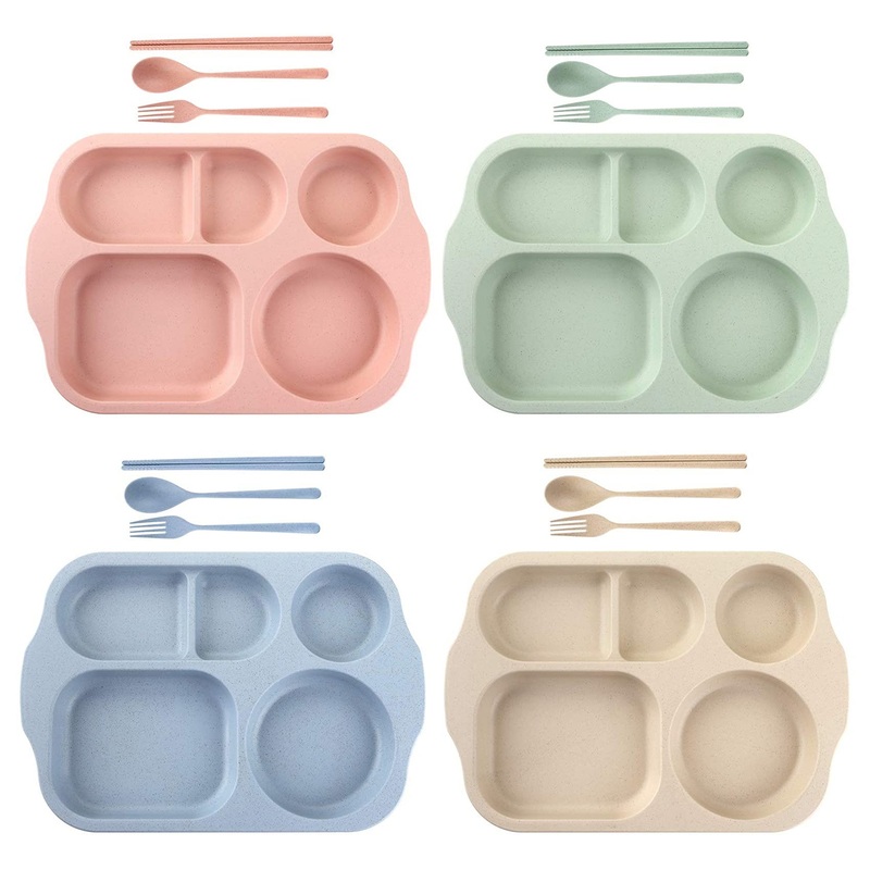 ZoauWuah colour: pink blue green beige Material: Wheat fiber Size: 30x21cmPackage Contents: 4 x Dinner plate 4 x Spoon 4 pair x Chopsticks 4 x ForkOnly the above package content, other products are not included. Note: Light shooting and different displays may cause the color of the item in the picture a little different from the real thing. The measurement allowed error is – 1-3cm.5. Divided Dinner Platter:Our products usually last years,and they are stackable.Don’t worry about the plastic pollution.Perfect for cereal,salad,fruit,rice and noodle.Perfect for school,camping,party,picnic,outdoor and everyday meals at home. 2. Large 12inch Plates: Designed with 12 inch sizesections.Space-saving style and smooth round edges,giving you good Contact.Deep enough for the food not to splashed out.5-compartments to hold different foods.Can be used by both kids and adults. 3. Lightweight And Durable: Our divided plates are lightweight to hold, they are unbreakable, chip resistance, no worry about falling down.A good alternative to steel and pure plastic plates. 1. Wheat Straw Material: Divided plates are made of natural wheat straw and PP material,a sustainable product that is safe,renewable,compostable and food safe.Free of BPA and other chemical material.Mom can give the baby peace of mind to use the wheat straw plate. 4. Easy To Clean: The plates are very easy to wash,you can easily wash them with soap and water or place them into dishwasher.